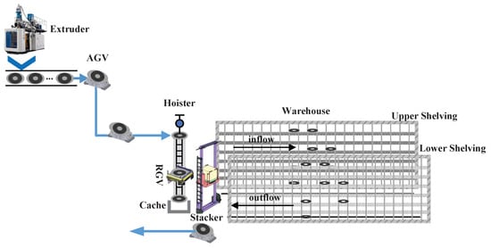 This case is an automatic tire tread handling system from an actual factory manufacturing line in China. As Figure 5 shows, the system consists of an extruder, an AGV, an automated storage and retrieval system (ASRS, which includes a hoister, an RGV, a stacker, and a large warehouse). The tire tread handling process is as follows: (1) the tire tread is extruded at the extruder and loaded onto the pallet; (2) after the pallet is fully loaded, it will be sent to the AGV point where it waits in line to be transported by the AGV; (3) when the AGV is available, it will carry the pallet to the entrance of the ASRS and then return for the next delivery; (4) in the ASRS, the pallet waits for the hoister to lift it up and load it onto the RGV if the RGV is available; (5) the RGV then transports the pallet to the stacker point; (6) when the stacker is available, it takes the pallet of tire treads to the designated storage unit and carries a pallet of tire treads out to the next process.
