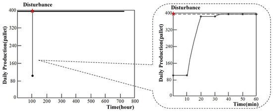 Using the DMEA and Monte Carlo-based simulation method detailed in Section 4, we evaluated the resilience of the tire tread handling system, and Figure 6 shows an example of the system’s resilience behavior after a certain disturbance. In Figure 6, the system begins operating in the normal state with a daily production of 390, and the disturbance occurs at 105 h on the stacker and causes a sharp decline in daily production. After the recovery action is taken, daily production restores to the normal state rapidly. Using Equation (2), the resilience to this particular disturbance is calculated to be 0.9225. Here, the simulation granularity is 10 min, i.e., the performance of the system is monitored and sampled every 10 min.