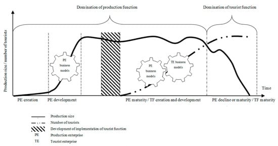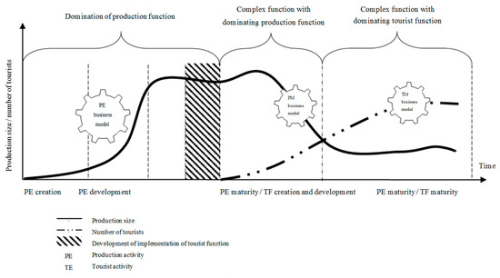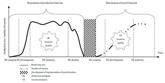 The above types of business activity, being at the same time as the introduced business model, can be described from the context of a widely discussed concept of organization life cycle [54,56,57]. For that purpose, the concept of the life cycle of an organization was completed with an additional transitional stage that takes place once the basic production activity was finished or when it is taking place, that is at the same time the moment when the new activity is being initiated. When analyzing the historical changes in the studied objects, it became evident that its concerns both the domination and development of tourist function. This concept was completed to identify key stages of tourist industrial enterprises emergence basing on industrial heritage.
