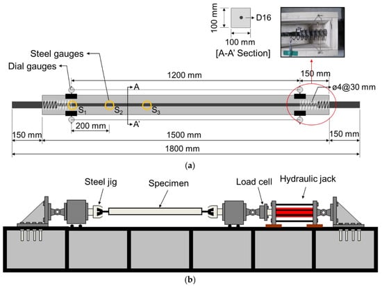 For the axial tension tests on concrete and SHCC ties reinforced with 16 mm single rebar, six prismatic specimens with 100 × 100 mm in cross-section and 1500 mm in length were fabricated and set up, as presented in Figure 1. To protect the steel bar from fracturing within the gauge length, i.e., the region that measures 1200 mm along the length of the tie, 25 mm protruding bar was connected to each end of the rebar through a high-strength coupler at each end of the central portion of the tension tie. Spiral reinforcement was placed around both ends of the tension tie to resist the concentration of bond stress between the rebar and cement composite. Figure 1a shows the seven strain gauges mounted along the rebar in the central region of each specimen. Axial load was introduced to the specimen by pulling the rebar that protruded from both ends of the tension tie specimen. To measure the average axial displacement in the central portion of the tension tie, two dial gauges were placed, as illustrated in Figure 1b. A specimen for each mixture was tested separately under monotonic loading and cyclic loading. Also, a specimen for each mixture was cyclically loaded at the average axial strain levels of 1000 μ and 2000 μ, respectively.