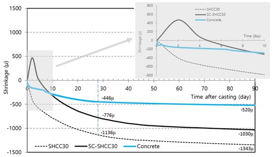 Figure 2 shows the measured ultimate shrinkage of concrete and SHCC materials under standard conditions up to 90 days. In this study, the measured shrinkage history of each mixture indicates that the ultimate shrinkage strain of SHCC30 mixture is very close to that of normal cement-based ECC reported in the literatures [21,22,23]. In the early stages, the drying shrinkage of the conventional SHCC30 mixture increased gradually, whereas during the first two days after casting, the SC-SHCC mixture, which contains 10% CSA-based EXA, exhibited a significant expansion of approximately 471 μ. Then, the SC-SHCC mixture started to shrink and showed a similar shrinkage pattern to that of the SHCC during early stages.