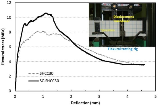 Figure 3 presents a comparison of the average flexural stress versus central deflection curves of SHCC prismatic specimens in the presence and absence of EXA. Table 3 and Figure 3 both show the positive effects of replacing 10% cement binder with CSA-based EXA on the flexural strength of PE- and steel fiber-reinforced SHCC materials. Figure 3 shows that shrinkage-compensated SHCC with EXA has greater flexural strength and less ductility compared to conventional SHCC due to the improvement of the interfacial adhesion that is caused by the formation of crystalline ettringite at the interface between fibers and surrounding cement matrix [24]. Corinaldesi et al. [25] also reported the effectiveness of CaO-based EXA on the improvement of flexural strength.