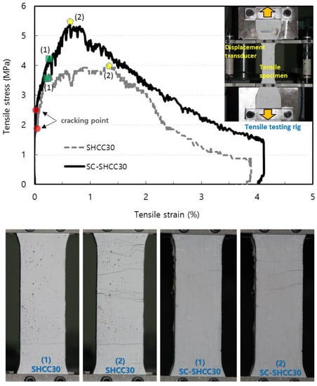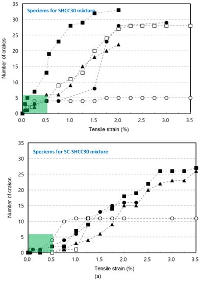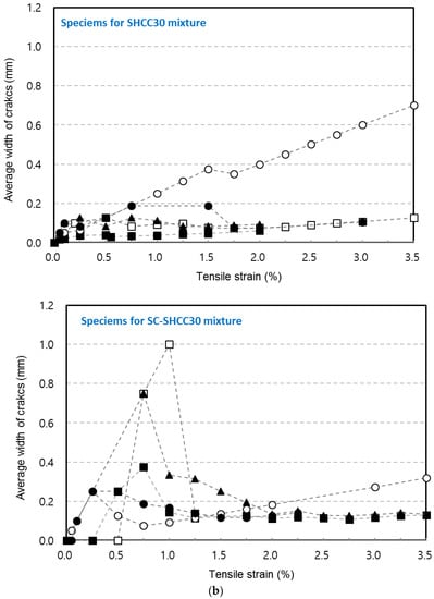 Figure 5a,b shows the number of cracks and average crack widths of the five dumbbell-shaped specimens for each SHCC mix, respectively. For the SHCC30 specimens, cracks occurred gradually from the initial loading stage whereas cracks in the SC-SHCC30 specimens started to increase after the tensile strain reached 0.5%. Although the average crack of the SC-SHCC30 specimen is wider than that of the SHCC30 specimen in the early loading stage, after the tensile strain of 1.0% is reached, the average crack widths for both SHCC mix specimens show slightly less than 0.2 mm.