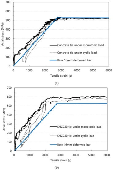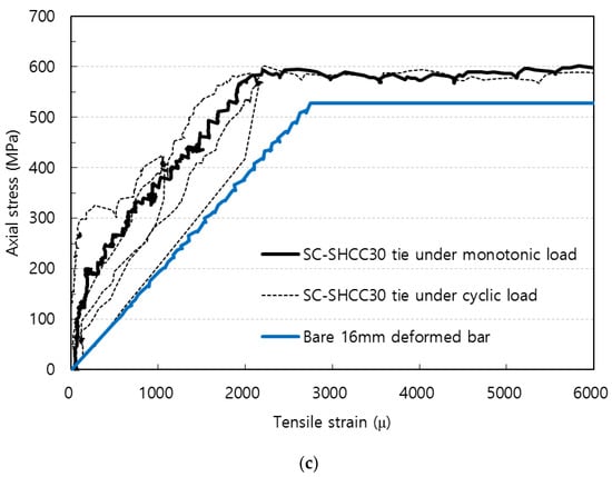 The average cracking strength values for the concrete, SHCC30, and SC-SHCC30 ties under monotonic and cyclic loadings are approximately 115, 135, and 243 MPa, respectively. The shrinkage compensation in the SHCC matrix caused by the CSA-based EXA prevented shrinkage cracks and led to an increase in the cracking strength of the reinforced SHCC tension ties, as shown in SHCC dumbbell-shaped specimens. Figure 6a shows that, beyond the cracking strength, the concrete ties experienced a gradual reduction in the tensile stiffness; this phenomenon is remarkable for a specimen under cyclic loading. Figure 6a shows that, as the tensile strain increases, the tensile response of the RC ties becomes like that of bare rebar. The tensile behaviors of the reinforced SHCC ties with or without EXA are almost identical in that, as the axial displacement increases after the initial crack, the tension-stiffening effect does not decrease up to yielding, as shown in Figure 6b,c. Figure 6 shows that, after the initial crack, the reinforced SHCC ties exhibit improved tension stiffening performance compared to the conventional concrete ties in monotonic and cyclic tension. This outcome may be due to the contribution of PE microfibers in bridging the micro cracks and of the steel macro fibers in resisting the tensile stresses across the macro cracks [26,27].