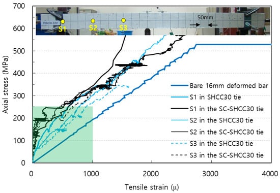 Figure 7 shows the local strain behavior of the rebar in the SHCC and SC-SHCC ties under monotonic loading. The tensile strain behavior of the SHCC30 tie at the first crack stage is not as obvious as that of the SC-SHCC30 tie due to the shrinkage-induced cracks that already had appeared. Fischer and Li [28] also reported this phenomenon for reinforced ECC ties. The test results suggest that the utilization of EXA in SHCC matrix with rich mixture may help control shrinkage-induced cracks and improve the tension-stiffening effect at the initial loading stage prior to cracking.
