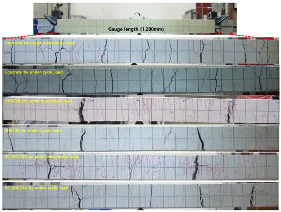 Figure 8 presents a comparison of the representative crack patterns in the gauge length of the RC and SHCC tension ties. The first transverse crack is shown to appear near the center of the gauge length for all the tie specimens. However, as the tensile load increases, the cracking processes in the ties show significantly different trends according to the loading method and matrix type. For the RC ties, the initial crack widens and additional cracks appear up to yield whereas the SHCC ties exhibit multiple cracking characteristics until the localization of several multiple cracks. Table 4 provides the cracking properties of all the tie specimens at yield. The SC-SHCC30 ties show greater cracking strength than the SHCC30 ties. The yield strength of the concrete tie is approximately equal to that of bare rebar, whereas the SHCC ties show on average 13% higher yield strength and tension stiffening even after the rebar yielded due to the fibers bridging the cracks. Figure 8 shows that the multiple cracking behavior is especially noticeable for the SC-SHCC30 tie, regardless of loading method. Table 4 presents the cracking characteristics of the concrete and SHCC tension ties.