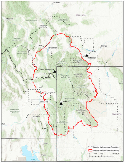 - Johnson, J.; Maxwell, B.; Aspinall, R. Moving nearer to heaven: Growth and change in the Greater Yellowstone Region, USA. In Nature-Based Tourism, Environment and Land Management; Buckley, R., Pickering, C., Weaver, D.B., Eds.; CABI: Wallingford, UK, 2003; pp. 77–88. ISBN 978-0-85199-732-2. [Google Scholar]