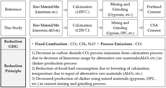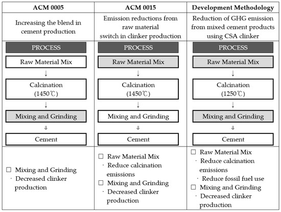 Korean cement companies are designed and managed by the ETS (Emission Trading Scheme) and TMS (Target Management System) considering the large amount of greenhouse gas emissions. Companies have studied a variety of ways to reduce greenhouse gases. Among them, some cement companies have developed CSA (calcium sulfoaluminate) cement with a lower rate of greenhouse gas emissions compared to conventional OPC (ordinary Portland cement) as a means to reduce greenhouse gas emissions. It is now necessary to develop a new methodology for the United Nations Framework Convention on Climate Change, Clean Development Mechanism (UNFCCC CDM) that meets CSA cement technology at an international level. The methodology will serve as a means for CSA cement developers to quantify greenhouse gas reductions. As of now, there is a “cement production methodology,” which is a registered methodology in the CDM, but this cannot be applied to CSA cement technology. Therefore, this study aimed to develop a new methodology for CDM that can quantify greenhouse gas reductions of mixed cement products using two or more clinkers with CSA cement technology.