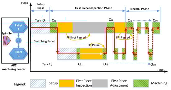 This study considers multiple phase of the process’s execution. A task will go through three phases in sequence, which are the setup phase, the first piece inspection phase, and the normal phase. A scene diagram of the APC system with first piece inspection is shown in Figure 1. There are two tasks on the machining center with APC, task is assigned to the pallet A while task on the pallet B. Firstly, the machine spindle works on pallet A because task has a higher priority than task . When task is submitted to inspection, the spindle switches to pallet B to process task . Secondly, the FPI of is also submitted after the first piece has been completed. Since the FPI result of task is qualified, task enters the normal processing phase and begins to process the remaining pieces. Task requires an adjustment because the first piece is unpassed. After the adjustment of has been completed, the machine spindle is switched back to pallet A to process another first piece. Task also enters the normal processing phase because the second FPI result passed. Finally, while both tasks are in the normal phase, the executions of task and task can be staggered util both tasks finished to reduce spindle downtime due to work piece changing. However, in some case pallets may not be switched, for example, the task on one pallet is urgent. When a task finished, the pallet assigned to it can be assigned to other tasks. The red line represents the running process of the machining center spindle. The red line between the two pallets indicates pallet switching, and the red dotted line indicates that the switching is optional. The white line indicates that the spindle is idle, because both pallets are involved in the FPI activities.