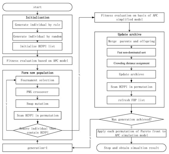 Firstly, the APCEA generates an initial population of N. After the evolution process of tournament selection, PMX crossover, and SWAP mutation, a new offspring is generated. If the offspring individual contains a RCFPI, the genetic operation need to be re-executed with a certain probability. When the number of offspring is equal to N, all offspring individuals need to be evaluated in terms of fitness. The parent population and the offspring population are merged to form a new population. Then, the non-dominant rank of each individual is obtained by the Fast Non-Dominated Sort [26] of the new population, and then the crowding degree of each individual is calculated. Finally, the individuals of the new population are sorted according to the non-dominance degree and the crowding degree, and the top N individuals are archived and will continue to be involved in the next generation. If the number of generations of the evolution is less than the maximum number of generations, the genetic operation continues to produce new offspring. Otherwise, the Pareto frontier is acquired, and the case needs to be re-scheduled using the APC simulation model to obtain the final scheduling target value.