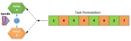 During the decoding phase, tasks are dynamically assigned to the pallets according to the priority. When a pallet is idle, the highest priority task of the remaining tasks is assigned to it. From the two tasks that have been allocated pallets, the machining center spindle selects the task that has arrived. If both tasks have been arrived, then break the tie by the priority.