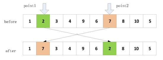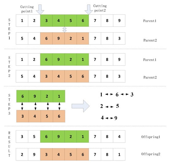 As shown in Figure 4, the mapping relationship of genes 1-6-3 is established. In step 3, there are two gene 1s in offspring 1, and they are converted into gene 3 by the mapping relationship until there is no conflict.