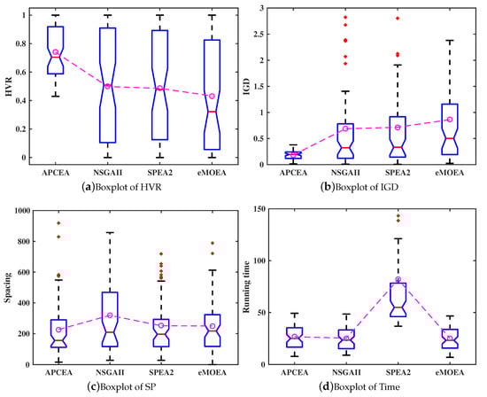 Figure 8 shows the comparison results of the four algorithms (APCEA, NSGA-II, SPEA2, -MOEA). For each performance metric, a Wilcoxon signed-rank test with the significance level of 0.05 was carried out on the results obtained by 30 independent runs of each method. The comparison results illustrate that the proposed APCEA performs significantly better than other three MOEAs in terms of HVR and IGD indicators. However, the APCEA is only significantly better than NSGA-II in three MOEAs for the metric of spacing, and it is only significantly better than SPEA2 in three MOEAs on the metric of running time. It can be concluded that the comprehensive performance of the proposed APCEA is still the best among the four algorithms.