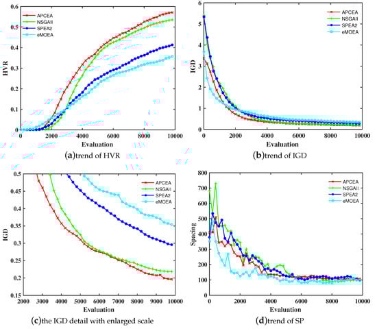 - The comparison results show that the proposed APCEA performs better than the other MOEAs (NSGA-II, SPEA2, -MOEA) under the same NFE. It is clear that the proposed APCEA method shows the fastest convergence speed and obtains the best performance in terms of HVR, IGD, and spacing indictors among the four algorithms.