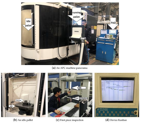 As shown in Figure 10, Figure 10a shows the panorama of a machining center with an APC that is processing the first workpiece. It contains an idle pallet and a running pallet. A portable android device(PAD) installed with the mobile application of the MES is called device Kanban. It is placed next to the machining center in the workshop and displays the current task list of the device. It can be seen from Figure 10b that the first workpiece of a task has been withdrawal from the idle pallet, and it has been sent to the inspection room in Figure 10c. There is a coordinate measuring machine (CMM) that is doing the first piece inspection in Figure 10c. Figure 10d is a workshop device Kanban, which shows a Gantt chart of the two pallets.