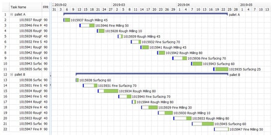 The factory planner thinks that the FPI pass rate of a new trial product being developed is 0.4, while that of other products that have been mass-produced is 0.9. It can be seen from Figure 12 that the tasks are loosely arranged, and the latest completion time of all tasks is 25 April 2019. As shown in Figure 11, the APC system has a tight task arrangement, and the latest completion time of all tasks is 15 April 2019, which is about 10 days earlier than that of Figure 12. It should be noted that column “FPR” denotes the first piece inspection pass rate. The scheduler usually tries to avoid RCFPI in industry practice. As shown in Figure 11, there are only one RCFPI, which are 3–14. On the contrary, there are four RCFPIs which are 3–14, 5–16, 6–17, and 9–20 in Figure 12. These detailed results confirm the above conclusions and verify the practical application value of the proposed method in industry practice.