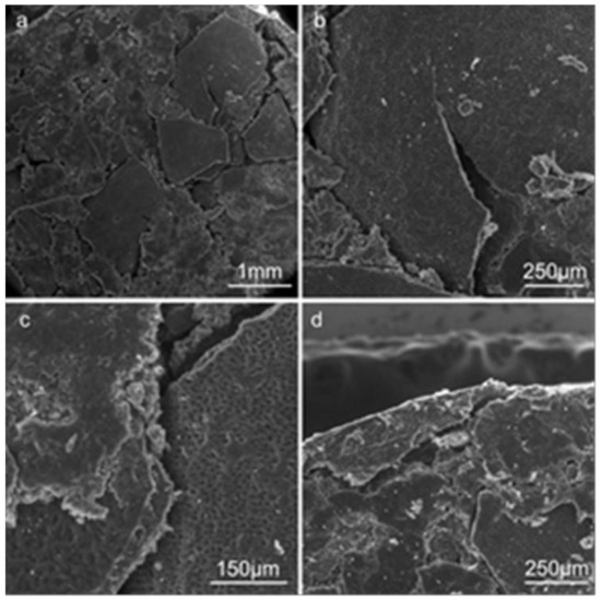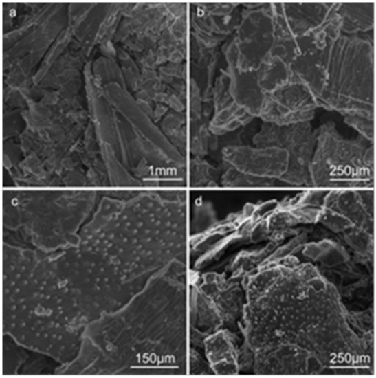 Rapeseed cake (Figure 2) is generally composed of two fractions. The first fraction contains particles with a relatively large surface area and small thickness. Those samples have clearly marked edges and fractures that testify to their hardness and brittleness. The discussed fraction is probably composed of fragments of seed coats that are very hard upon maturation. The seed coat of rapeseed comprises several layers of dead slightly elongated cells that are closely packed to produce a tight, hard and thick coat. Seed coat cells are characterized by different cell wall thickness, which produces a layered structure [35,36]. The second fraction is distributed between the particles of the first fraction. It is composed of smaller (<200 µm) particles that closely adhere to one another, which suggests the presence of fat and protein compounds. Rapeseed cake is an abundant source of fat and protein [13]. Those compounds probably contribute to the agglomerate’s cohesiveness. The corresponding samples have relatively smooth edges, and large segments of broken material are not observed despite numerous fractures.