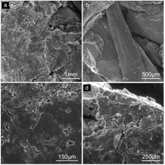 The surface structure of 100% brewer’s grain pellets, characterized by a high fiber content [2], is presented in Figure 3. Those pellets are composed of differently sized particles, including larger, elongated particles that are perpendicular to the applied compression force and smaller particles in between them. A similar structure was described by Bledzki et al. [37]. The particles differ significantly in the structure. Some particles, both longer and shorter, have a fibrous structure, which suggests that they originated from the same barley grain or germ tissue. Other particles are covered by small spherical protrusions that represent characteristic formations on external cells of the seed coat [38,39]. The resulting material is less cohesive, it has a looser structure and its particles are not densely packed. Such pellets have an uneven surface and edges, and they chip easily.