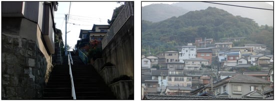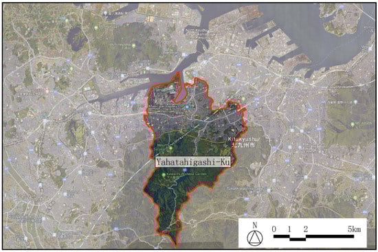 We selected the Yahatahigashi-ku district in Kitakyushu, Japan, for this case study. Most of the areas in this district are mountainous, with steep slopes. The residential buildings were built for employees during the period of Japan’s industrialization. From 1960 to 1970, Kitakyushu supported Japan’s rapid economic growth, by aggregating material industries, such as steel, chemical, metal, and ceramic industries. This aggregation began when the government-managed Yahata Steelworks, the largest steelworks company in Asia, was founded in 1901. During that period, to accommodate employees, dwellings were constructed on the mountain, around the industrial area.