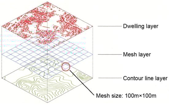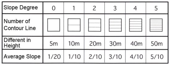 To evaluate the steepness of these areas, we developed the slope degree method as a standard. For a mid- to large-scale urban area, a 100 m × 100 m grid platform is commonly used to reflect the building environment [,]. The variations in height and average slope for each 100 m × 100 m mesh can be calculated by counting the number of contour lines in each mesh area, as shown in Figure 3.