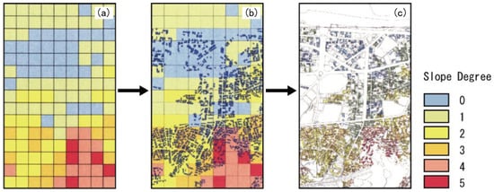 Representation of the building slope degree (a slope degree of each mesh; b: layer overlapping; c: slope degree of each building).