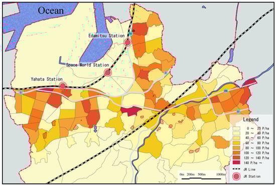 The shrinking of cities, as a result of declining urban population has attracted increasing attention within the global scientific community []. A shrinking city is defined as an urban area that has experienced demographic decline, economic downturn, and geographic contraction []. The technological revolution created a new global economic pattern [,], which has led to the outflow of capital and human power []. Urban decline during the processes of globalization is more remarkable in cities supported by a single industry []. Decreasing birth rates and population size have further accelerated the reduction in the use of urban public facilities in Japan. New housing and community services could promote a greater life quality, and the concentration of urban facilities could increase the urban efficiency. In Japanese cities, the ideal population density, along bus lines, is 40 inhabitants per ha, and 50 inhabitants per ha, along metro lines []. Population density appears to have a strong relationship with the quantity of commercial facilities, within a walkable distance []. Density values should, therefore, be considered in the process of urban redevelopment, to achieve efficient organization of public transportation and commercial operations. Shrinking cities must be radically redesigned to be both better and smaller [].