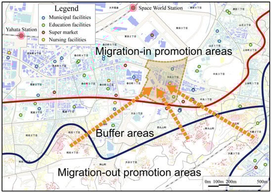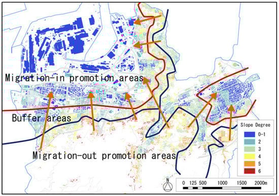 Leveraging the analysis conducted on urban population (see Section 3), using urban geographic data, we created an encompassing redevelopment plan to promote urban vitality. We proposed a migration from the sloped-mountainous area to the flat area, to concentrate the population in this flat area, to create a compact city center, thus, promoting a livable community. We identified the area promoting inward migration, the area promoting outward migration, and the buffer area, using the results through the GIS analysis, as shown in the Figure 11. We selected flat areas to be the object region for inhabitant migration. The migration is expected to concentrate and reduce the city size, thus, improving the efficiency of city services and facilities.