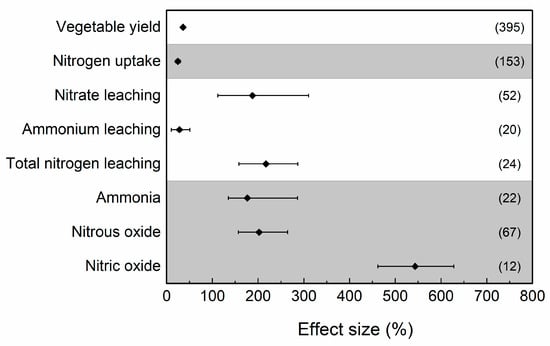 The response of nitrogen loss and production to nitrogen fertilization is shown in Figure 2. The application of nitrogen fertilizer significantly increases nitrogen losses including leaching and gas emission. It makes a noticeable impact on the environment, causing almost three times nitrate leaching and total nitrogen leaching (2.88 times (CI: 2.11–4.10) and 3.17 times (CI: 2.58–3.87), respectively). In terms of gas emission, its application in greenhouse vegetation elevates the emission of ammonia, nitrous oxide and nitric oxide by 176.42% (CI: 135.1–286.1%), 202.02% (CI: 156.8–264.7%) and 543.3% (CI: 461.8–627.9%), respectively. Compared with nitrogen losses, its application increases the nitrogen uptake and vegetable yield by 24.5% (CI: 19.9–29.8%) and 35.7% (CI: 31.8–40.1%), respectively.
