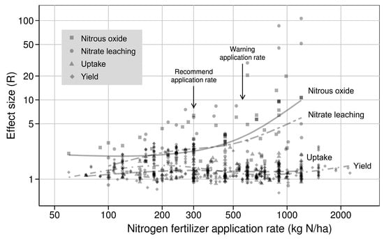 Although many individual experiments have examined the response of nitrogen loss to different nitrogen fertilizer application rates, it is difficult to draw general conclusions because of various planting environment and limited samples in each study. As such, meta-analysis (details in Section 2.2) appears to be a feasible approach tackle these problems. Here, this study demonstrates that a non-linear relationship exists between nitrogen loss and nitrogen fertilizer application rate (Figure 3). The effect of fertilization on both nitrous oxide and nitrate leaching are much higher than that on yield and uptake. It means that the application of nitrogen fertilizer causes more environmental problems than that brings productivity.