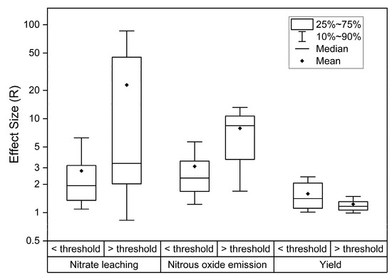 The effect of nitrogen application on the nitrate leaching, nitrous oxide emission and yield below and above the thresholds. The effects are expressed as effect size R (the ratio of the treatment group result to the control group result).