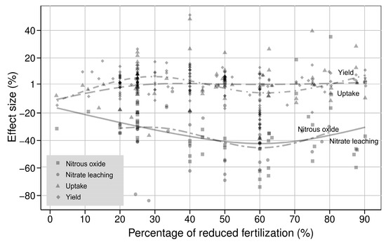 In order to have clear understanding of the effect of reducing fertilization, we calculated the percentage of reduced fertilization relative to conventional application rate and depict the relationship between it and nitrogen losses and productivity (Figure 7 and Figure 8). The results indicate that the effect size of nitrogen losses is obviously smaller than one. It means reducing fertilization can significantly reduce the nitrogen losses. When the conventional nitrogen application is cut by 40–60%, the nitrate leaching (−45.1%) and nitrous oxide emission (−42.6%) both are reduced to minimum levels (Figure 7 and Figure 8). The trends of nitrogen uptake and yield reflect the feasibility of reducing nitrogen application on overall productivity. The effect size of nitrogen uptake and yield stabilize at one despite of the reduction in nitrogen application rate. This suggests that a moderate reduction in nitrogen application does not sacrifice the vegetable yield.