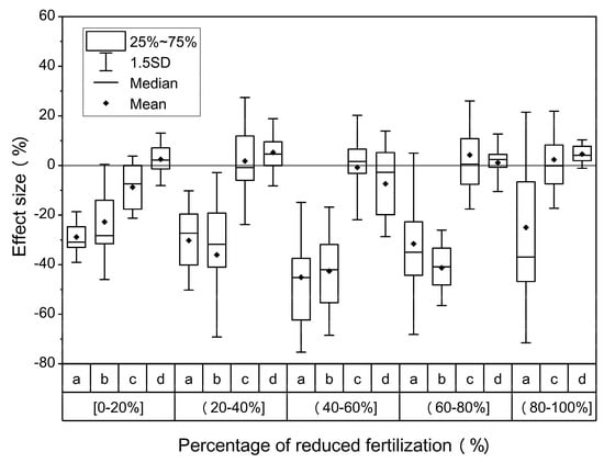 Traditional parametric models rely on the assumption that the observations of treatment and control groups are normally distributed. However, few experimental results in the ecological field can satisfy this requirement. To this end, we adopt the bootstrapping method to test the significance and estimate the confidence limits [32]. The mean effect size and the 95% confidence limits are produced using bootstrapping (9999 iterations) in this study. If the 95% confidence limits overlap with zero, the treatment is considered to have significant effects. We apply meta-analysis to quantify the effect of nitrogen fertilization (based on data in the first group, in which the control treatment is NN) and reduced nitrogen fertilization (based on data in the second group, in which the control treatment is CN). All meta-analysis is calculated using OpenMEE—an intuitive, open-source, free software for meta-analysis in ecology and evolutionary biology [34]. To better present the results, we use the form of percentages (R − 1) × 100% to represent the effect size.