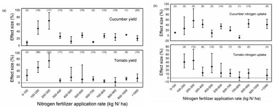Effect of nitrogen fertilizer application on yield (a) and nitrogen uptake (b) of major vegetable species (i.e., cucumber, tomato) in greenhouse vegetable production (GVP). The effect size is represented by (R − 1) × 100%. R is the ratio of the treatment group result to the control group result. The bars represent 95% confidence intervals. The number in each parenthesis represents the number of paired observations.