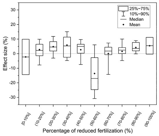 Effect of reducing nitrogen fertilizer application on yield. The effect size is represented by (R − 1) × 100%. R is the ratio of the treatment group result to the control group result.