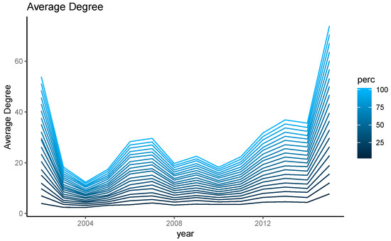 Figure 4. Average degree in an organic dairy farmers network 2002–2015. Each line represents a modeled degree of sociability ranging from 5–100%, reflected by the gradient.