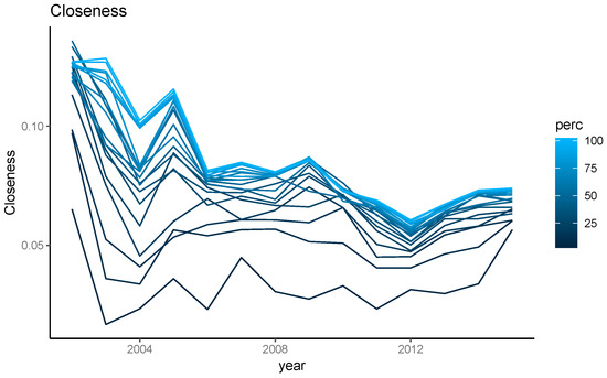 Figure 6. Closeness (Centrality) in an organic dairy farmers network 2002–2015. Each line represents a modeled degree of sociability ranging from 5–100%, reflected by the gradient.