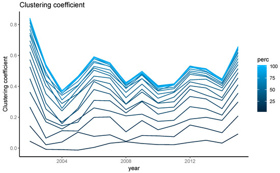Figure 7. Clustering Coefficient in an organic dairy farmers network 2002–2015. Each line represents a modeled degree of sociability ranging from 5–100%, reflected by the gradient.