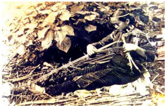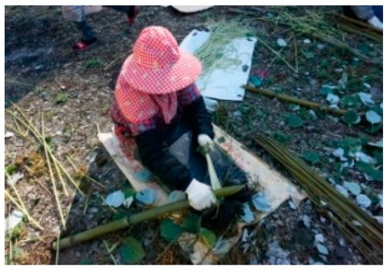The Seediq females start the complicated procedures from ramie collection, the first step of which is to scrape ramie to separate the fibers from the epidermis (Figure 3). According to Seta Bakan’s mother, this process cannot be completed quickly, and only patience with the process can improve the quality of scraping. Then they have to go through the complicated processes of exposing, finishing, twisting (Figure 4), boiling, and dyeing the yarn (Figure 5) before it can be used for weaving. Traditional Seediq men mainly dedicate themselves to hunting, while farming is the major task of women. Some hard-working Seediq women will twist threads on the way to farming fields.