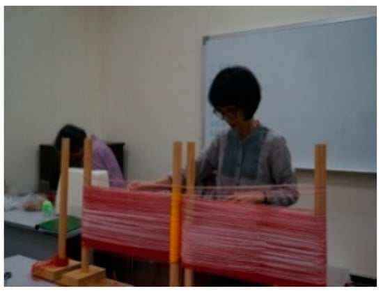 By contrast, the motivation of the Indigenous community for learning weaving lies in the practical needs of clothing for dancing performance. While weaving is a common technique mastered by all elders of the tribe, the young generation has never learned to weave. During this course, unlike the urban community, where students obtain looms only through purchase, some trainees in Indigenous communities bring their old weaving boxes with them, and some ask their peers to make them a new one. In the learning process, from warping to weaving, they follow the instructions of the teacher without questioning her teaching methods or using the organization chart made by the teacher. That is, they are used to tacit knowledge dissemination and prefer “to be” rather than “to have”. They learn what the teacher teaches in the same way that their elders learned weaving—by recollecting what kind of cloth their family has, and learning and reproducing the demonstrated techniques. For example, among these trainees there are two sisters whose mother is very good at weaving, especially the weft picking method, so they are looking forward to learning this method from their teacher. More clearly, this course follows the hands-on method, meaning they are learning knowledge through practice [].
