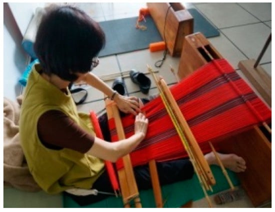 The technical presentation of Taiwanese Indigenous people is based on a complete cultural ecology corresponding to life field, belief, religion, social stratum and clan organization []. The social transformation has led to the migration of the indigenous population to cities [], which inevitably changes the cultural ecosystem of weaving. Nevertheless, the approach to cultural commodities will lose many important factors in the traditional cultural ecosystem. The two communities in this case learned the technique of ground weaving, which is closer to the traditional cultural ecosystem. Instructor Seta Bakan learned weaving from her grandmother. “I have not taught students before, so I will watch how my grandmother does it and teach those trainees as my grandma did…” For the instructor, teaching is a review of culture, and learners receive traditional tacit knowledge and practice. Through the study of backstrap loom weaving, non-indigenous communities in metropolitan areas, have an opportunity to get closer to the Seediq culture. That is to say, weaving can become a platform for outsiders to understand the Seediq culture. The learning in native tribes allow trainees to stay closer to the traditional cultural ecosystem, as the use of weaving tools and techniques are the same as those used by their elders. Therefore, the interactive communication in the course can present the elements of traditional cultural ecosystem from time to time, such as the reproduction of the “division of labor between men and women, the cultural taboo that men dedicated to hunting are not allowed to touch the weaving box” and women cannot touch the hunting gear, the value of “being a woman”, and the personal training that enables trainees to know how tiresome weaving was for their elders. The course also strengthens family cohesion, meaning it strengthens the sense of generation, such as the two Indigenous trainees looking forward to learning their mother’s favorite weft pick, which provides family members with more common topics. “The table cloth woven by my mother remains in the church. Now I am also a weaver, so I feel closer to my mother…” (I2).