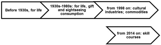 UNESCO’s Convention for the Safeguarding of Intangible Cultural Heritage, as signed in 2003 points out that intangible cultural heritage is living heritage [], thus, its safeguarding should prioritize the “process” rather than the “result”. The practice of traditional techniques, and the resulting creations, should be a community-centered cultural practice in daily life []. Traditional craft is part of the intangible cultural heritage protected by the Convention, and the preservation and safeguarding of techniques mark the action taken by the Convention to provide a sense of historical continuity. To this end, community is an important carrier of preservation and inheritance.