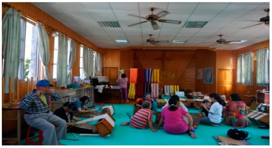 In 2017 the news that Seta Bakan had opened traditional weaving courses in an urban community was known by the Indigenous tribe. A community of Nantou Nanfeng Village tribe, one of the indigenous Seediq tribes, was registered as the group to preserve traditional Seediq dance. When performing traditional ceremonial dance, this group wanted to wear self-made clothes, so they invited Seta Bakan to teach weaving in the tribe. The course has lasted for two years. Most of the trainees are middle-aged and elderly women, eight of whom have never been absent within these two years. None of them knew how to weave before, but they had seen their elderly family members weave. In the first year of the course, they learned to weave plain weave and weft pick in the second year. These tribal women have to do farming and housework on weekdays, and some even help take care of their grandchildren, so the course is given in a church, in order that the locals need not spend too much time in traffic. The schedule is flexible: one period is an evening when women have spare time, and the other period lasts for a whole day. The duration of each program is 80 h divided in five weeks. Since the church is open at all time, trainees can arrange their own schedule and continue weaving even if the instructor is not available. This is why the sound of cloth being woven can be heard in early morning or late night hours (This scene seems to be closer to the habits of traditional Seediq women.). This course will continue in 2019, as it is provided near the tribe, and such convenience makes trainees willing to continue learning, students also enjoy the flexibility of the class schedule, as they can balance work and learning. When non-trainee Seediq Indigenous people walk into the site, Seta Bakan will also teach them weaving techniques in her Indigenous language (Seta Bakan said that the site in indigenous area is not so formal as that metropolitan area, and the communication in local languages makes them happy and closer.), regardless of who they are. Moreover, while they are talking, their collective memories and individual traditional weaving skills will somehow emerge, which provides an opportunity for the communication and recollection of traditional culture (Figure 16).