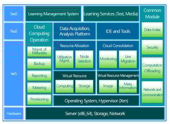 On top of PaaS, learning management systems, visualizing, and other services can be categorized as software as a service (SaaS). Across the boundaries, there are common modules such as data indexing, security, computation offloading, and networking. The cloud computing operation part of the Figure includes metadata management, backup, reporting, metering, and provisioning modules.