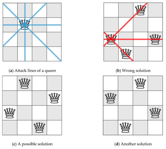The simple approach to the n-queen problem is to use an exhaustive search. However, the search space of this approach is huge. If we consider n = 8, for instance, there are 648 (= 248 = 281,474,976,710,656) possible placements for eight queens on the 8 × 8 board. Then, we remove placements in mutually attacking locations. Hence, we use a more efficient algorithm for the n-queen problem based on a state space tree.