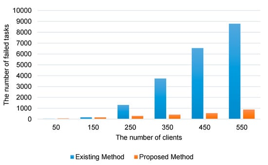 Figure 3, when the numbers of clients are 50 and 150, the results of the existing method and the proposed method are comparable. However, as the number of clients increases, the performance gap between the two methods is noticeable. When the number of clients is 250, the proposed method has 4× fewer failed tasks.