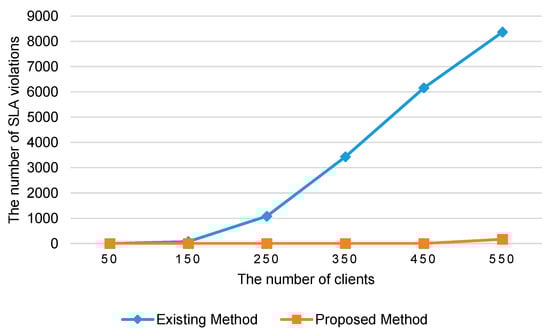 Figure 4 shows the number of SLA violations as the number of clients increases. The SLA violation is defined as a slow response for the requests and the SLA violation occurs when more tasks are allocated to overloaded virtual machines. Similar to the previous experiment, our proposed method has much fewer SLA violations compared with the existing method (about a 48× improvement when the number of clients is 550).