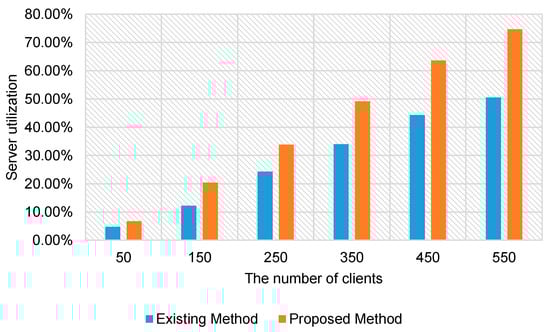 Figure 5 shows the average server utilization for host machines. Because the proposed method is capable of managing more tasks from clients (our method has fewer failed tasks than the existing method), the average server utilization for our proposed method is higher than that for the existing method. The percentages of the average server utilization for the existing method are 4.75%, 12.22%, 24.30%, 33.96%, 44.32%, and 50.58%, while those for the proposed method are 6.75%, 20.38%, 33.80%, 49.17%, 63.64%, and 74.64%. The implication of this result is that our method can deal with more tasks while introducing fewer SLA violations, and our proposed cloud resource management scheme is effective.