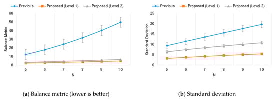 Figure 6 depicts the balance metric and standard deviation for the previous method (master–slave architecture) and the two proposed methods (Level 1 and Level 2) in terms of monitoring messages. Note that when
