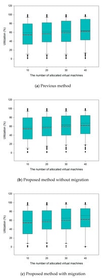 Figure 7a,b, we observe that those hosts running the same virtual machines have a noticeable difference than the previous method. The section between the 25th and 75th percentiles for the proposed method is shorter than that of the previous method. At the same time, the median value for the proposed method is higher than that for the previous method. Comparing the previous method and the proposed method with migration, the average utilization is about 62.1% and 68.3%, respectively. Note that the average value of