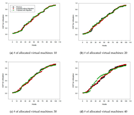 Figure 8d as an example, CDF for migration of the proposed method with migration slowly grows and ranges from 0 to 20, since about 10% of hosts are powered off. In the middle ranges from 20 to 50, CDF for utilization of the proposed method with migration rises sharply in comparison with the other two methods. The reason for this is due to the cloud consolidation capabilities of the proposed method. More specifically, when performing the virtual machine allocation algorithm, it compares two resources and checks whether all virtual machines of a host can be migrated to another host. If it is available, all the virtual machines of a host are scheduled for migration, then the host can be powered off for power reduction.